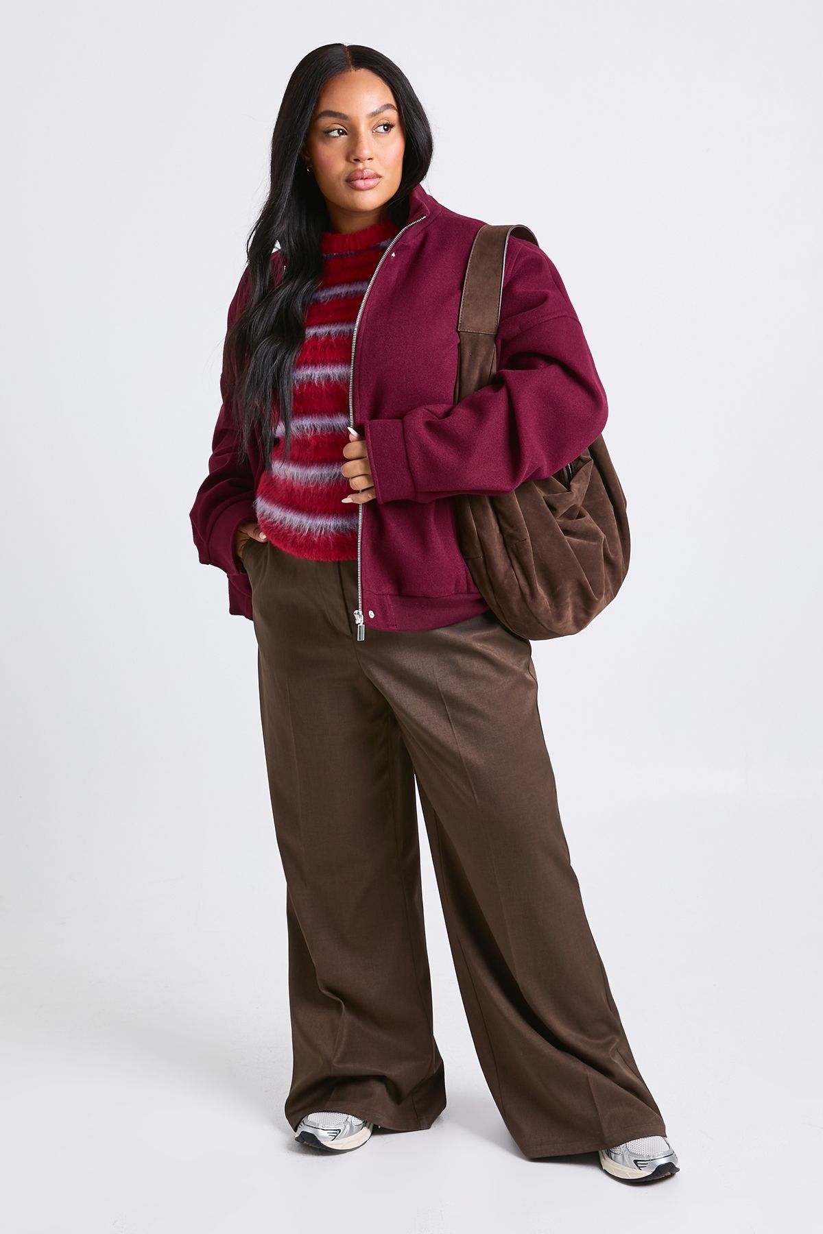 - Ribbed collar detail adds a classic bomber jacket element Make a bold statement with this plus size oversized bomber jacket from Boohoo. The exaggerated proportions create a fashion-forward silhouette that's right on trend this season. Style it as shown with wide-leg trousers and a patterned jumper for a casual yet put-together look, perfect for weekend brunches or shopping trips with friends. The versatile design works brilliantly with both casual and slightly dressier outfits-pair with your favourite jeans and trainers for daytime errands, or throw over a simple dress with ankle boots for evening gatherings. The generous fit allows for easy layering over chunky knitwear when temperatures drop. This bomber jacket is an essential addition to your casual wardrobe, offering both style and practicality for everyday wear. Complete the look with a spacious shoulder bag for an effortlessly cool ensemble.