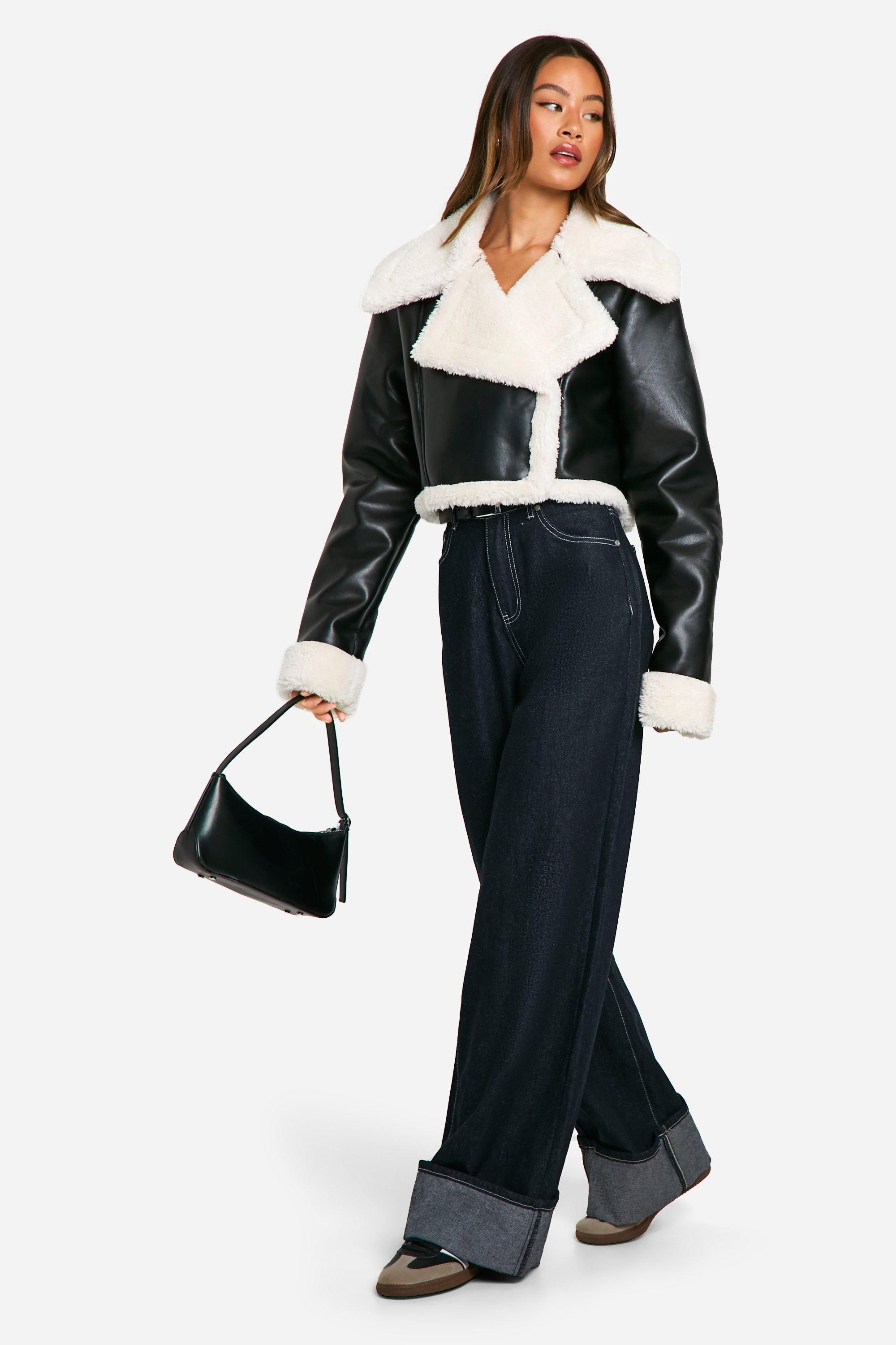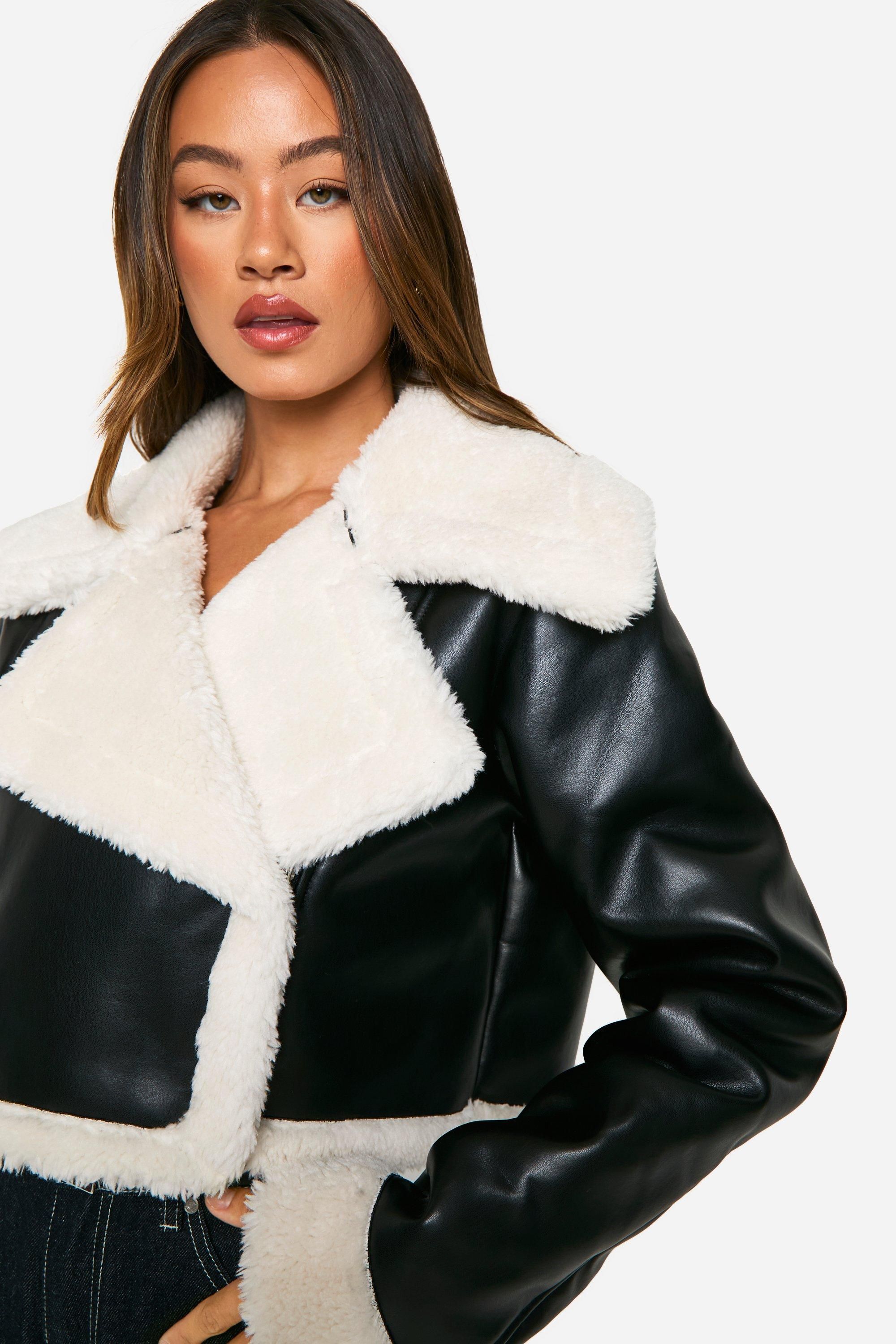 - Make a bold statement with this striking cropped leather-look jacket. The contrasting faux fur lining and oversized collar add a luxurious touch, while the asymmetrical zip closure gives it an edgy, contemporary feel. Perfect for the fashion-forward Boohoo girl, this jacket is ideal for casual outings and family gatherings. Style it with high-waisted wide-leg jeans and chunky trainers for a trendy daytime look, or throw it over a midi dress and ankle boots for an evening out with friends. The cropped length makes it a versatile piece that can be paired with both high-waisted bottoms and dresses. For a complete ensemble, accessorise with a small shoulder bag and some statement earrings. This jacket is a must-have addition to your wardrobe, offering both style and practicality for the cooler months.