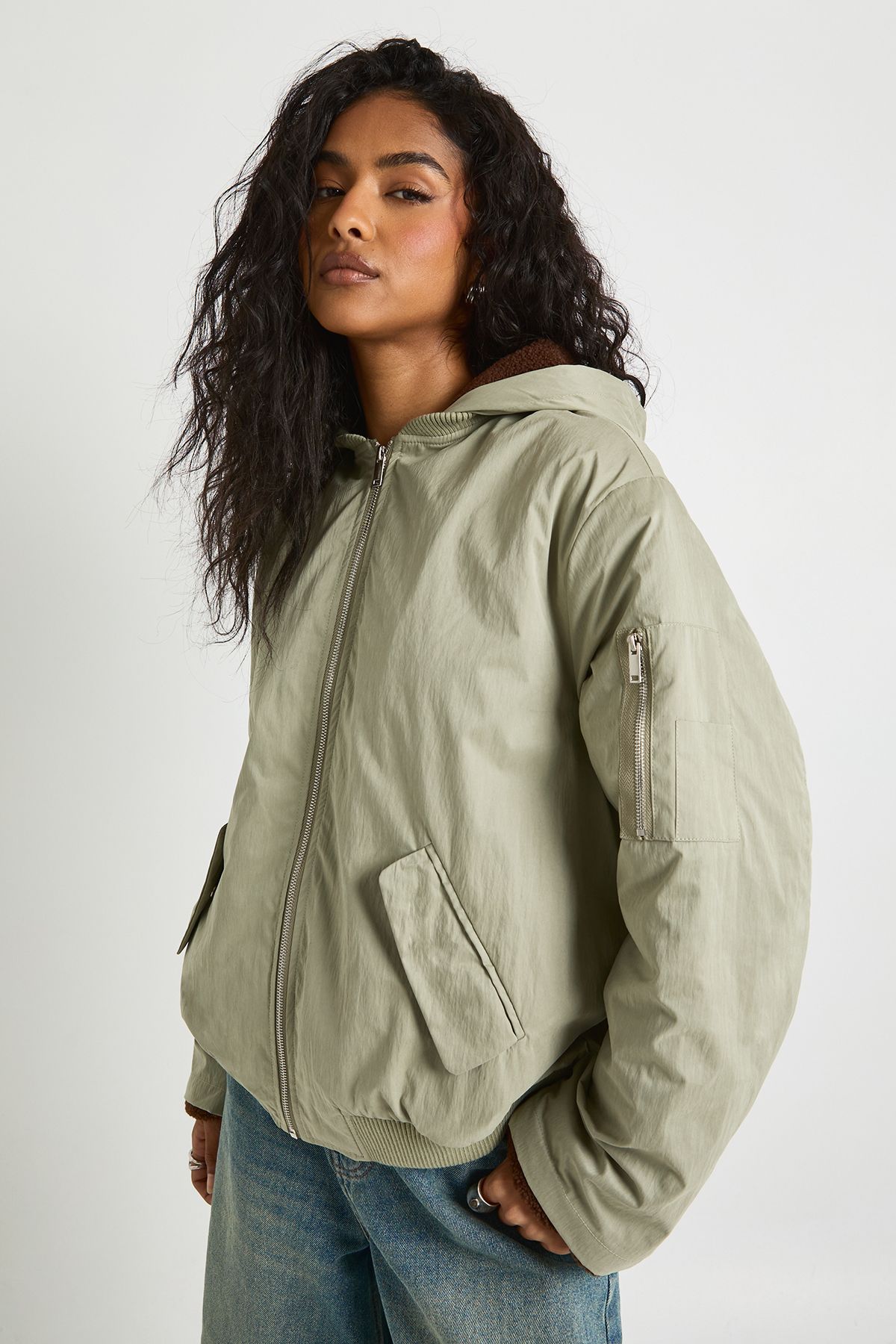 • This Teddy Hooded Bomber Jacket combines casual comfort with street-style edge, making it an essential addition to your autumn-winter wardrobe. The soft teddy texture creates a cosy feel whilst the classic bomber shape ensures you stay on-trend. Style with denim culottes and a simple crop top for an effortlessly cool daytime look, or throw over a mini dress with chunky boots for evening drinks with the girls. The versatile design works brilliantly for family gatherings, weekend shopping trips or casual coffee dates. The practical hood adds extra functionality for unpredictable British weather, whilst the relaxed silhouette allows for easy layering as temperatures drop. Machine washable and available in UK size 10, this Boohoo staple delivers both style and practicality for the fashion-forward woman who values versatility in her wardrobe.