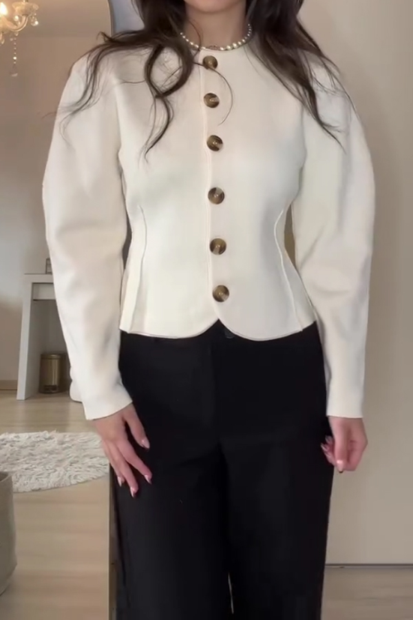 • Women Elegant Office Round Neck Long Sleeve Short Jacket + Skirt Suit