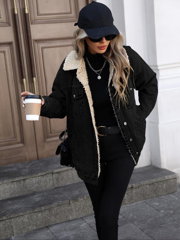 Women's Fall Winter Casual Fashion Jacket, Elegant Solid Color Stand Collar Thickened Warm Denim Coat, Versatile Outerwear for Women