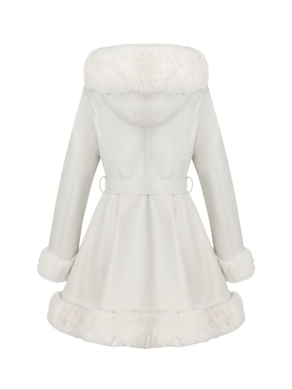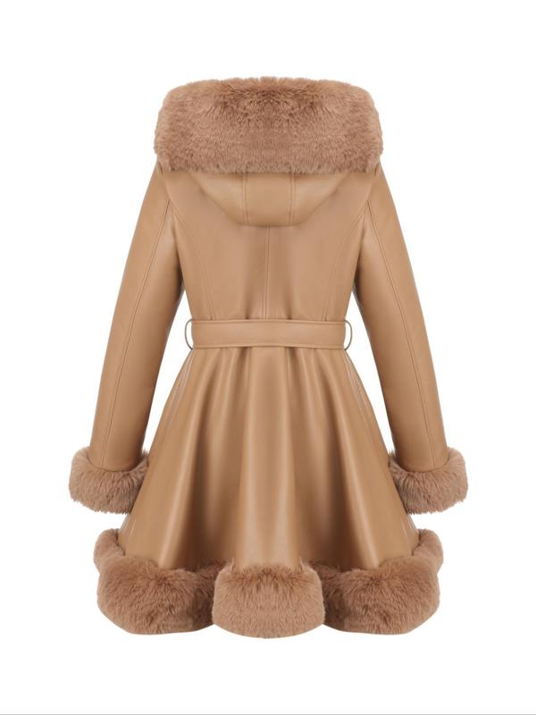 Women's Fall Winter Faux Leather Jacket with Detachable Belt, Long Sleeve Fitted Coat with Hood, Casual Warm Daily Wear