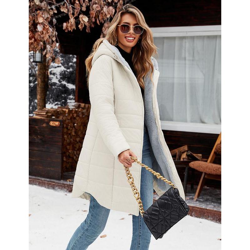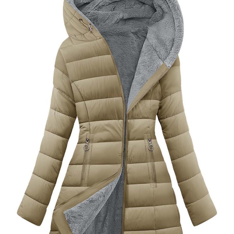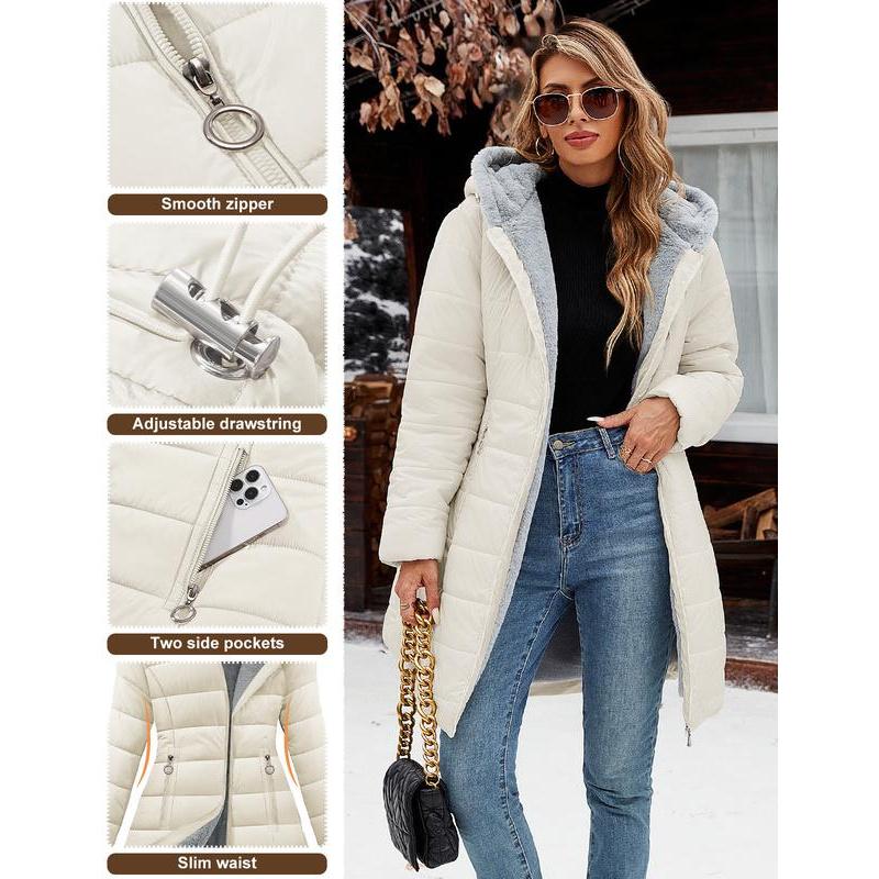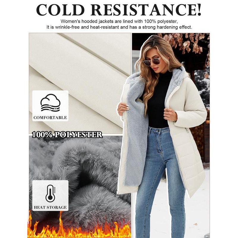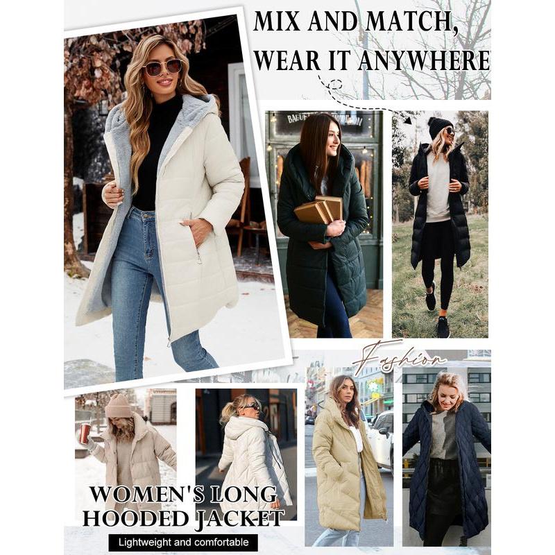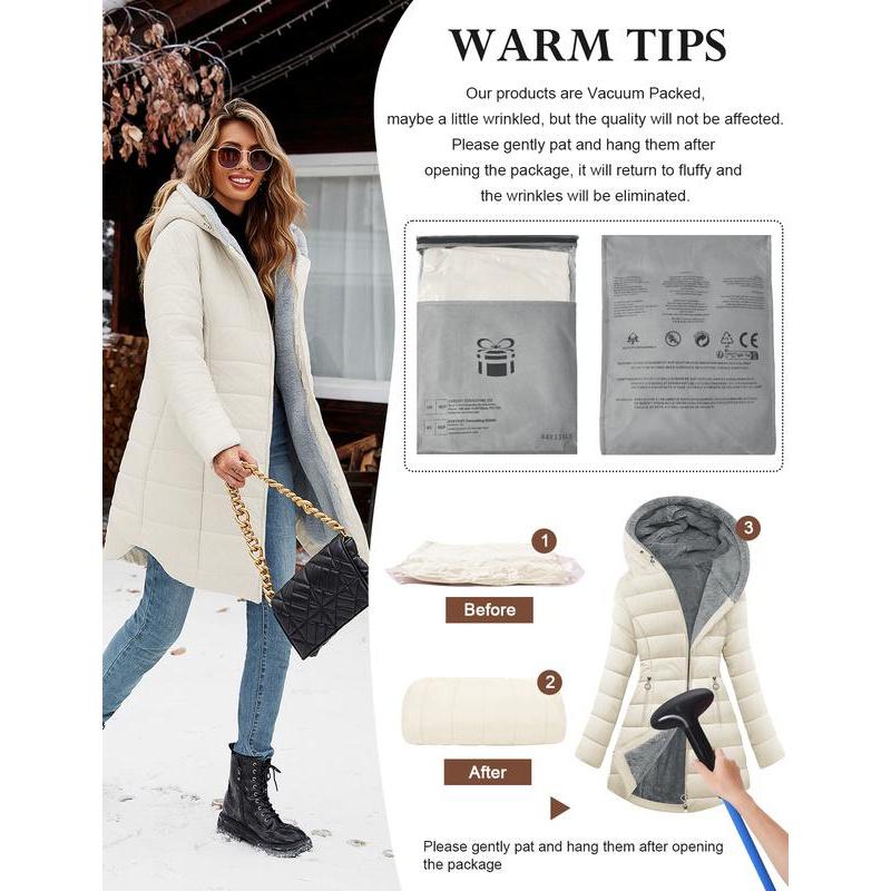 Classic Feminine Silhouette: Engineered to enhance your curves, this winter coats for women features a slim-fit design that cinches at the waist while maintaining warmth.The versatile mid-thigh cut creates height-enhancing proportions, strategically covering waist, hips, and thighs.Womens winter coats with an adjustable drawstring hood for full coverage wind protection from head to lower body.Stay chic while staying bundled against winter chills Design: Winter parka for women is designed with full zipper zip closure allows for easy on and off.The thickened fleece lining keep your face and body warm even in the harshest conditions (please note that the sleeve positions are not fleece lining in order to maintain wearing comfort).Tow zip pockets keep your hands warm and comfortable, for keys, phone, wallet and other small items.This shapely windproof winter jacket combines contemporary casual style with practicality Versatile Coat Jacket: Long puffer jackets, long sleeve coats, furry coats for women, fluffy jackets for women, winter jackets for women, sherpa fleece jackets for women, full zip coats, womens coats mid length, hooded jackets, slim fit outwear, fall clothes for women, going out outfits for women, long parka coats for women, down coats with pockets. Our womens puffer jacket is as Christmas, New Year, Thanksgiving, Mothers Day presents for family and friends Occasions: Complete cold weather protection, keep you warm from heavy rain to freezing snow, ideal outdoor coat for Working, Daily wear, Party, Hiking, Climbing, Traveling Snow Mountain, Camping, Hiking, Skiing or any.This long winter jacket comes in multiple colors, making it easy to pair with jeans, sweaters, boots, casual shirts, hoodies, jeans, dresses, skirts, knee boots.This versatile and comfortable winter coat is puffy and soft, adding an extra touch of elegance to your overall look Size & garment care: Available in s,m, l, xl, xxl. Please refer to warm puffer jacket womens size chart for specific measurements to reach your fit. To maintain the longevity of women's long coats, machine wash in a laundry bag (gentle cycle) or hand wash in cold water. The women's winter coat will be folded and compacted inside of the package when delivery, so you may feel it thin and flat, if so, lightly pat the jacket with your hands and then have it hang