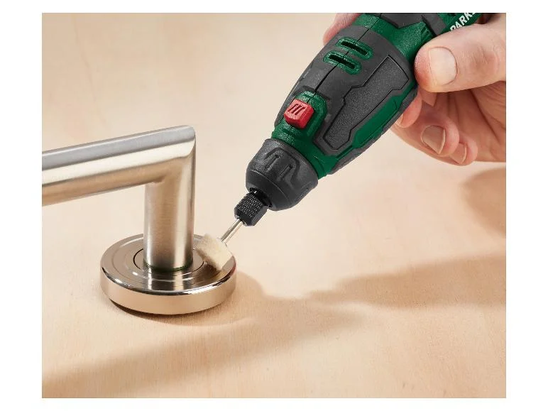 | Accessoires: | 1 câble de charge USB-C (1,5 m), 1 mandrin fileté, 3 disques de polissage, 1 mandrin pour manchons abrasifs, 4 manchons abrasifs, 1 fraise cylindrique (pierre), 1 fraise à disque (pierre), 1 brosse métallique, 1 collet (prémonté), 1 brosse en plastique, 1 fraise (HSS), 1 fraise à graver, 1 outil de montage, 1 pâte à polir |