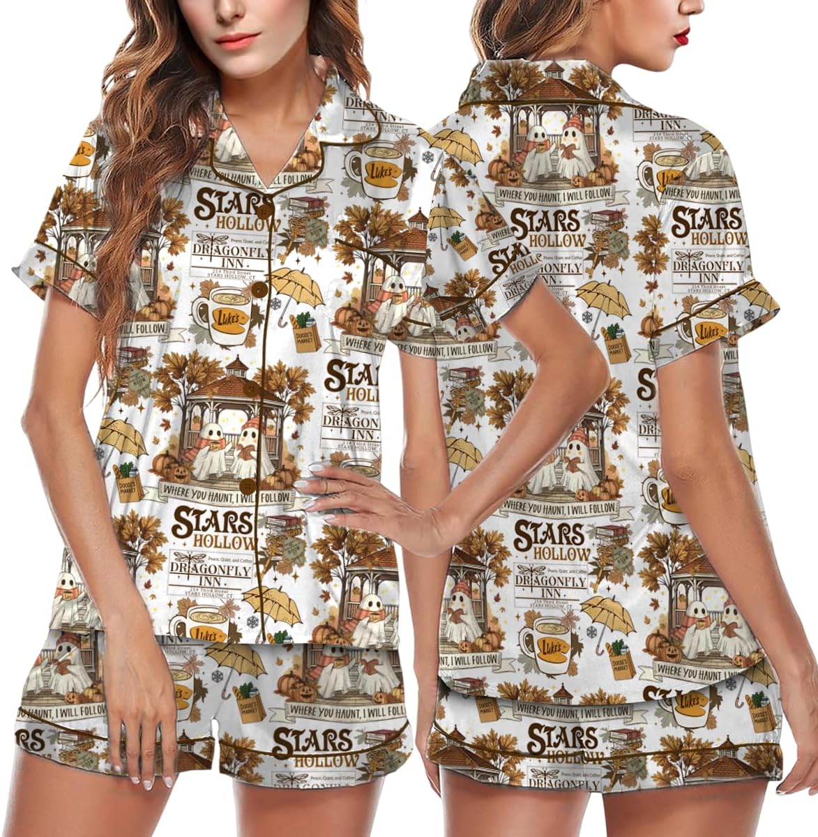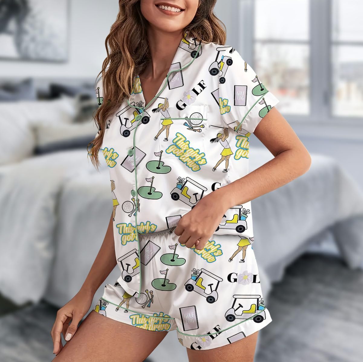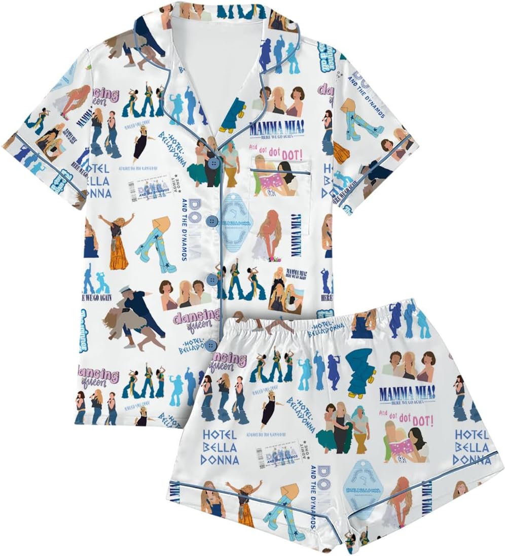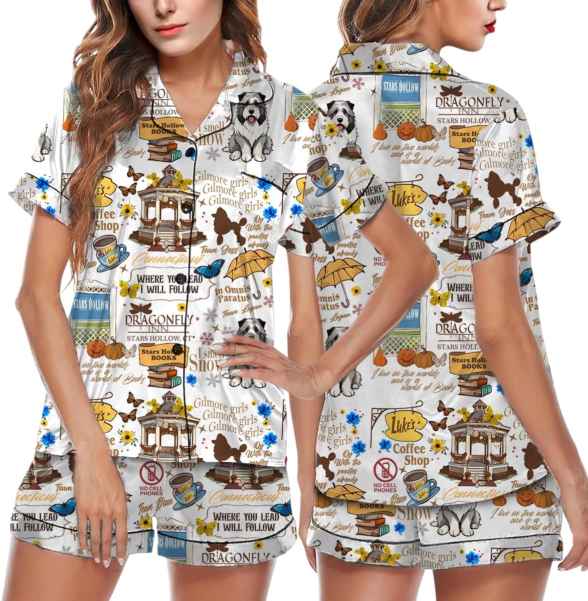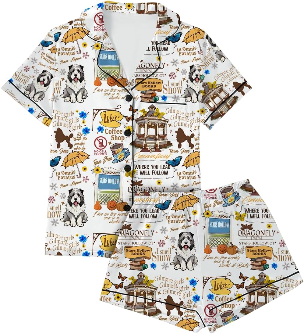 Design: Loungewear sets woman features a cute dog print on a classic silhouette, blending elegance with a touch of whimsy, The button-down top and elastic-waist shorts with side pockets offer lightweight comfort for effortless lounging