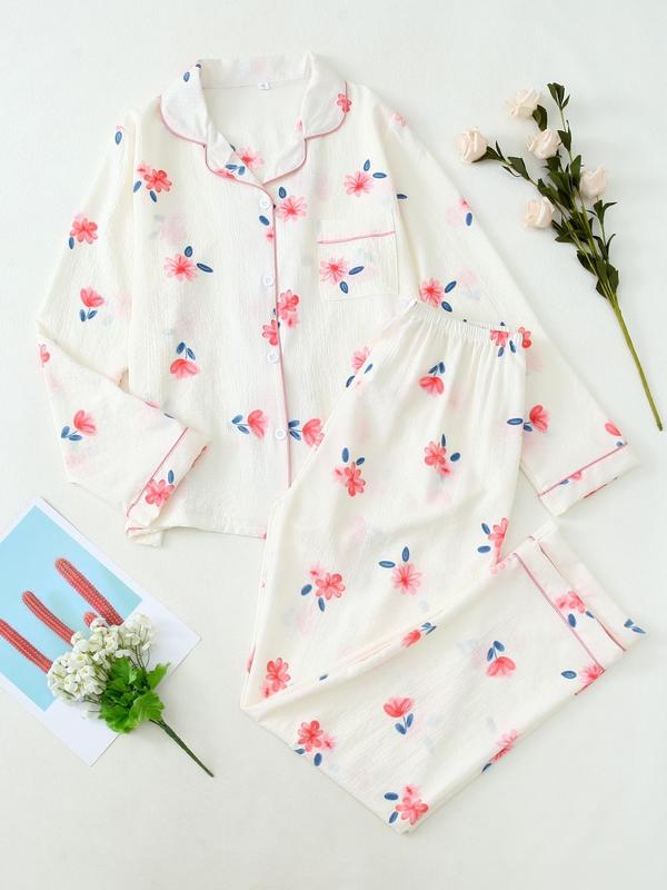 Women's Button Front Blouse & Bow Front Contrast Binding Pants Pyjama Set, Casual Long Sleeve Lapel Top & Trousers, Summer Outfits 2024, Sleepwear for Spring & Fall, National Day Offers